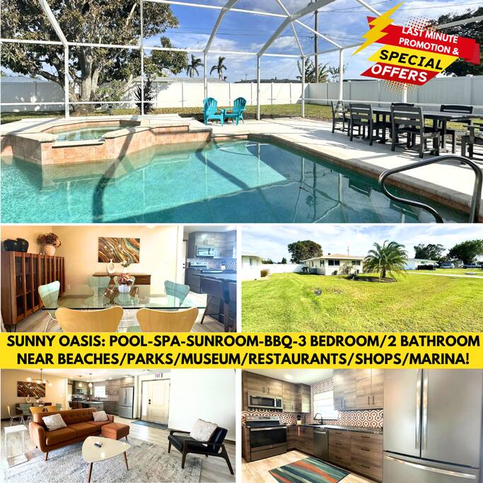 ☆ ★ LIVING ROOM ★ ☆ Step into a beautifully crafted open-concept living room that features a comfortable sofa and chairs, a ceiling fan, a flat-screen TV, an end table, a coffee table, and direct access to the sunroom, which leads to the pool area. ★ ☆ KITCHEN & DINING ☆ ★ Enjoy a spacious open-concept kitchen with a stylish island and 3 bar stools, perfect for casual dining. Modern appliances include a refrigerator, beverage refrigerator with glass door, oven/stove, microwave, blender, dishwasher, and coffee maker. A glass dining table accommodates 6, making it ideal for meals and gatherings. ☆ ★ BEDROOMS ★ ☆ This home features 3 beautifully designed bedrooms, each equipped with a ceiling fan. The stunning master bedroom boasts a king-size bed, a TV, a walk-in closet, a dresser, nightstands, a full-length mirror and an ensuite bathroom. The second bedroom offers a full-size bed, a closet, and a dedicated workspace with a desk and chair. The third bedroom also includes a full-size daybed, a dresser and a closet, ensuring comfort and convenience for all guests. ☆ ★ BATHROOMS ★ ☆ This home features 2 bathrooms for your convenience. The private ensuite master bathroom includes a tiled stand-up shower with glass sliding doors, a vanity sink with a mirror, and a toilet bowl. The guest bathroom is designed for comfort, offering a tiled tub-shower combination with sliding doors, a toilet bowl, a stylish vanity sink with a mirror, and a hair dryer. ☆ ★ SUNROOM ★ ☆ Our sunroom is bathed in sunlight, providing direct access and a lovely view of the pool. It features a TV, a ceiling fan, and a split-type air conditioning system for added comfort. Glass sliding doors connect it to the living room for easy entry. Plus, we have a sofa bed that sleeps 2 guests, making it a perfect spot for relaxation and extra sleeping space! ☆ ★BACKYARD ★ ☆ The fully fenced backyard features lush grass and comfortable sun loungers, perfect for relaxing outdoors. ☆ ★HEATED POOL AND SPA★ ☆ The pool area is a delightful sanctuary, featuring a screened-in design that offers a blend of comfort and fresh air. It boasts outdoor dining furniture for enjoying meals al fresco and a soothing spa, making it an ideal spot for relaxation and entertaining. * At an additional fee* ☆ ★ADDITIONAL FEATURES★ ☆ We have a BBQ Grill with no extra cost located in the pool area, two parking spaces are available in the driveway. This is a non-smoking property, and this home has Wi-Fi for your convenience . We provide a starter supply of liquid soap, dish soap, dishwasher soap, paper towel, toilet paper, and garbage bags. ☆ ★ABOUT THE AREA★ ☆ Nestled in the picturesque city of Cape Coral, this location is a haven for outdoor enthusiasts and those seeking a relaxed lifestyle by the water. Known for its extensive canal system, Cape Coral offers residents and visitors unparalleled access to boating, fishing, and water sports. The serene waterways are perfect for leisurely days spent kayaking or paddleboarding, making it easy to immerse yourself in Florida's natural beauty. The area is rich in recreational opportunities, with numerous parks and trails ideal for biking, walking, or picnicking. Families will appreciate the nearby playgrounds and community events that foster a strong sense of belonging. Cape Coral is also home to a vibrant dining scene, featuring everything from cozy cafes to upscale seafood restaurants, where you can savor fresh local cuisine while enjoying waterfront views. In addition to its outdoor attractions, Cape Coral boasts a variety of shops and boutiques, providing unique shopping experiences just a short drive away. For those seeking a bit of adventure, attractions like the Sun Splash Water Park offer fun-filled days for all ages. Plus, beautiful beaches on Sanibel and Captiva Islands are easily accessible, making it simple to enjoy the sun and surf. With its friendly community atmosphere, stunning landscapes, and diverse recreational options, Cape Coral is the perfect destination for anyone looking to enjoy a quintessential Florida experience. Experience the best of Cape Coral and make unforgettable memories at our waterfront retreat. Whether you’re seeking adventure or relaxation, you’ll find it all here. Book now and start planning your Florida escape!