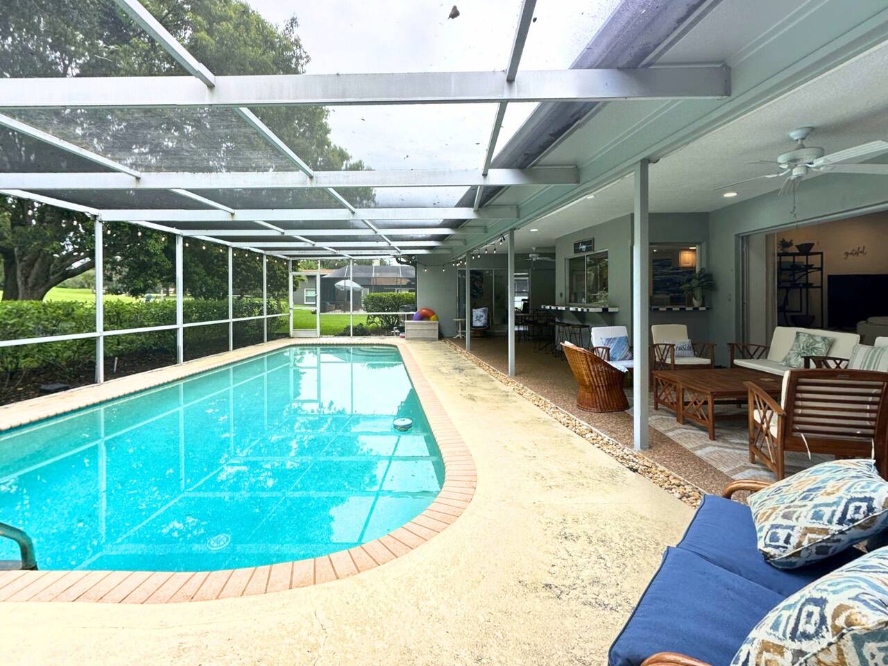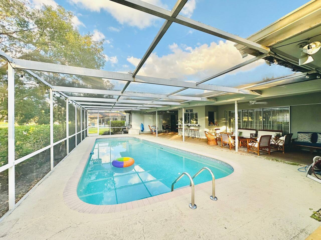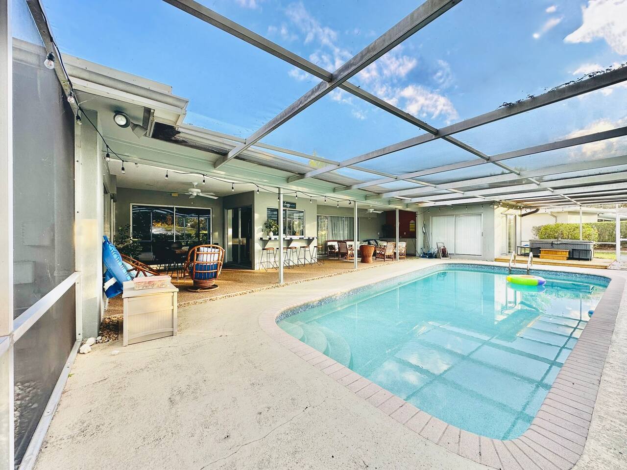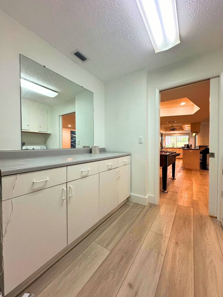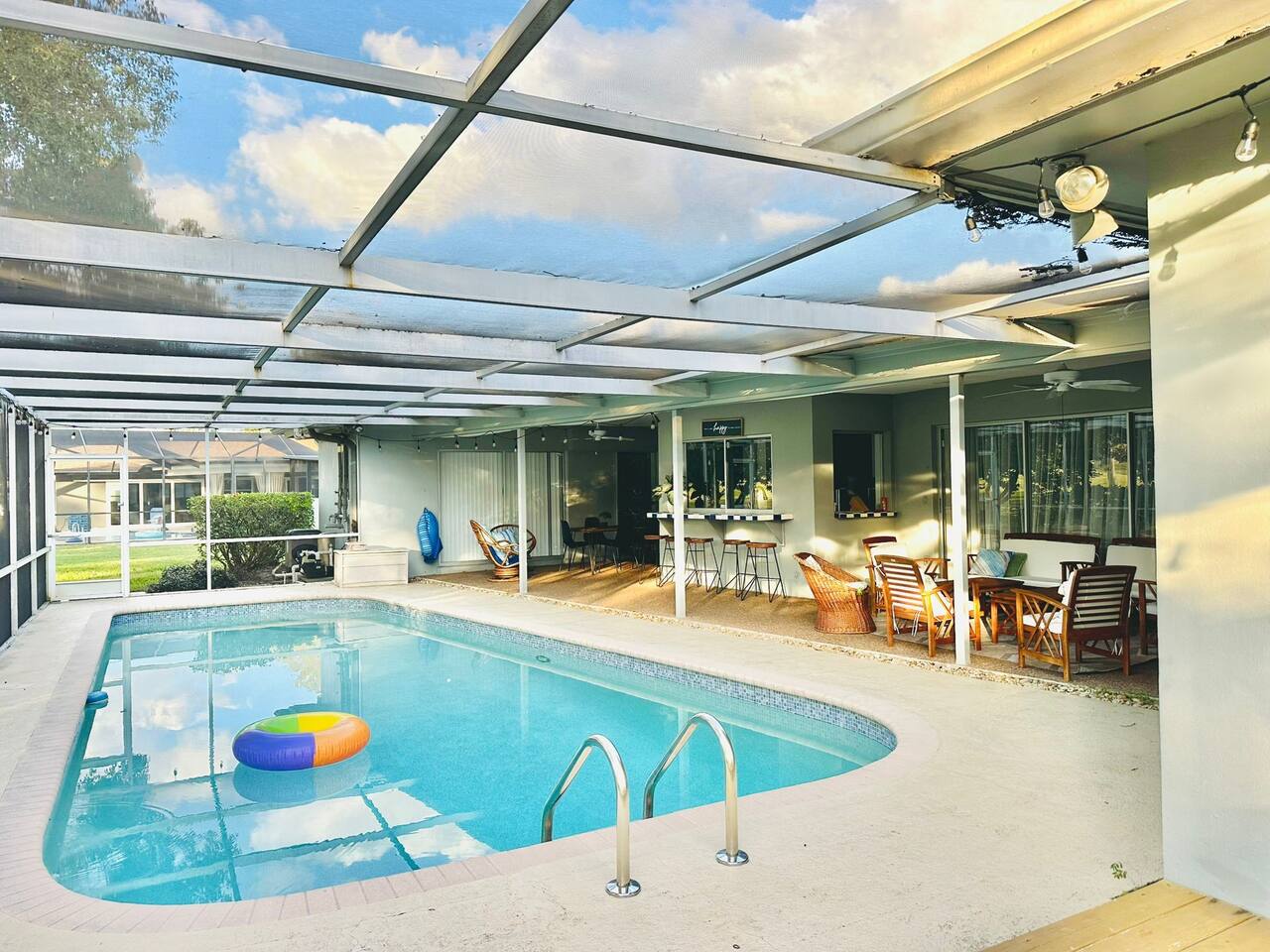Welcome to our spacious open concept living, kitchen, and dining area. Here, you'll discover everything you need for relaxation and entertainment. Whether you prefer sinking into our plush sofa, gathering around the dining table for a meal, enjoying a lively game of foosball with family and friends, or simply relaxing on the hot tub while enjoying the panoramic view of the pool and golf course, our space is designed to cater to your comfort and enjoyment. Our second living room is a haven of comfort and leisure. It showcases a beautiful grand piano, inviting you to create music and unwind in a serene atmosphere. The room offers a picturesque view of the pool, adding tranquility to your experience. Ample seating options abound with multiple cozy sofas, ensuring everyone can relax and socialize comfortably. Furthermore, the living room offers additional sleeping arrangements: one sofa bed that accommodates 2 guests and another futon that can accommodate 1 guest. Step into our well-appointed kitchen, where cooking becomes a delight! Our space is fully equipped with all the essentials: refrigerator, oven/stove, dishwasher, microwave, blender, coffee maker, toaster, and much more, ensuring you have everything you need for effortless meal preparation. The inviting ambiance is ideal for family gatherings, boasting two dining tables—one indoors accommodating 6 guests and one outdoors accommodating 6 guests —that comfortably seat twelve guests in total. Additionally, we have a breakfast island bar equipped with 6 bar stools, perfect for quick morning meals. Our master bedroom features a luxurious king-size bed with a nightstand, bedside lamp, a TV, and a ceiling fan. A full-length mirror and spacious walk-in closet offer convenience, while a dedicated desk provides a comfortable workspace or simply to enjoy pampering yourself with the natural lighting from Florida's sunshine. The ensuite bathroom provides privacy and luxury. Enjoy direct access to the outdoor hot tub and pool, seamlessly blending indoor comfort with outdoor relaxation. Whether you're resting indoors or enjoying the amenities outside, our master suite is designed for your comfort and enjoyment. Moving to our second bedroom, you'll find a comfortable queen-size bed accompanied by a TV for entertainment, a bedside lamp, nightstand, dresser, shelves, full-length mirror, and a generous closet, ensuring a serene and restful environment. Additionally, this bedroom has a direct access to one of the bathrooms. Bedroom three offers a serene atmosphere with its king-size bed and thoughtful addition of a baby crib, along with a bedside lamp and ample closet space. Bedroom four continues the theme of comfort and convenience with its king-size bed, nightstand with bedside lamp, full-length mirror, closet, providing a peaceful retreat for guests, a rocking chair and a patio door with a direct access to the pool. Each bedroom is equipped with a ceiling fan to ensure comfort and ventilation throughout your stay, completing the welcoming and relaxing atmosphere of our accommodation. Our home features 3 bathrooms designed with your comfort in mind. The Guest Bathroom #1 offers a thoughtfully designed tub-shower combination, a toilet bowl, a hair dryer, and a stylish vanity sinks with two mirrors. Guest Bathroom #2 is equipped with a convenient stand-up shower, a vanity with mirror, a hair dryer, and a toilet bowl and this bathroom has direct access to Bedroom #2. In the Master bathroom, you'll discover vanity sinks with mirrors, a toilet bowl, a bathtub, a hair dryer, and additionally a convenient stand-up shower. We've meticulously designed our Lanai to maximize your outdoor enjoyment. It features a convenient outdoor bar station perfect for mixing drinks and hosting gatherings with ease. Ample seating is provided for lounging and dining al fresco, creating a comfortable and inviting atmosphere. For added luxury, indulge in our pool or hot tub and enjoy the serene golf course landscape beyond or fire up the grill for a barbecue. Our property boasts a washer and dryer conveniently situated in the laundry room by the garage, provided at no extra cost. Moreover, there are two parking spaces available in the driveway. This is a non-smoking property, and this home has Wi-Fi. We provide a starter supply of liquid soap, dish soap, dishwasher soap, paper towel, toilet paper, and garbage bags. About the Area: Located in the heart of Clearwater, our property offers more than just convenient access to Florida's renowned beaches; it provides an ideal retreat for both relaxation and exploration. Just minutes away from our doorstep, Clearwater Beach beckons with its accolade as one of the top beaches in the U.S. The beach's soft, powdery sands and turquoise waters create a picturesque setting perfect for sunbathing, swimming, or enjoying water sports like parasailing and jet skiing. The vibrant beachfront area, including Pier 60, is alive with street performers, artisans, and stunning sunset views, making it a must-visit during your stay. Surrounding our tranquil location are lush green spaces and natural attractions that cater to outdoor enthusiasts. Folly Farms Nature Preserve, a short drive away, invites visitors to explore its pristine woodlands and marshes, offering scenic hiking trails, birdwatching opportunities, and peaceful picnic spots. It's an ideal escape into nature for those seeking tranquility and natural beauty. For those looking to stay active, the nearby Ream Wilson Clearwater Trail offers miles of scenic biking and jogging paths that wind through picturesque landscapes and alongside tranquil waterways. Families will find no shortage of activities to entertain all ages in Clearwater. The Clearwater Marine Aquarium, home to the famous Winter the dolphin from the movie "Dolphin Tale," offers educational exhibits and live animal encounters that inspire and delight visitors. Philippe Park, nestled on the shores of Old Tampa Bay, combines histo