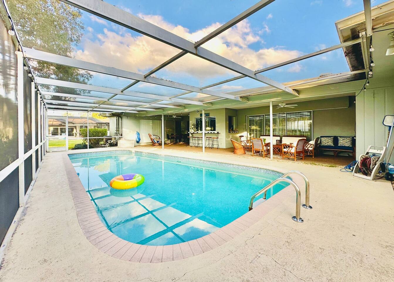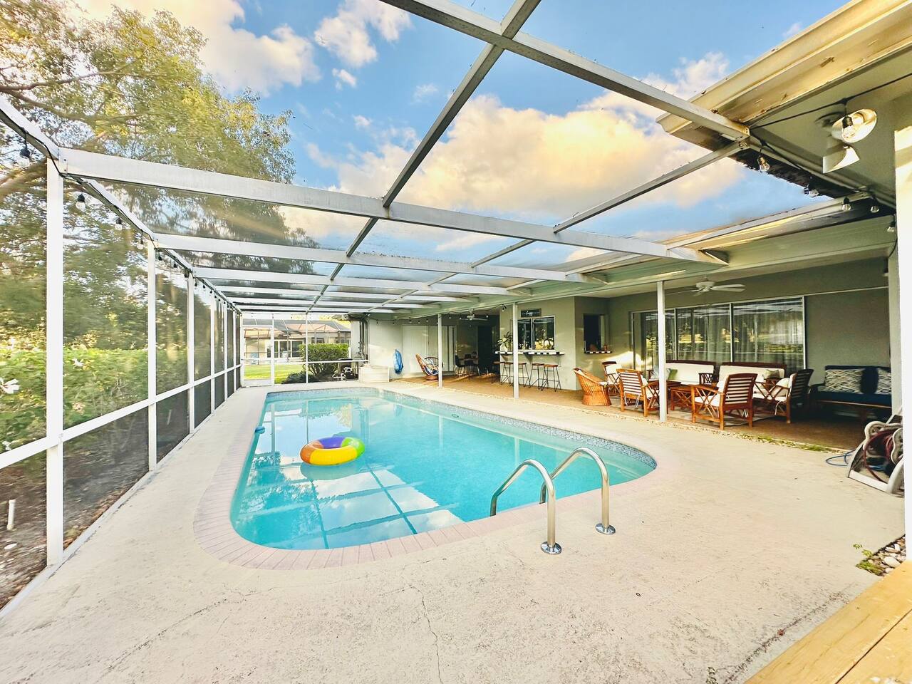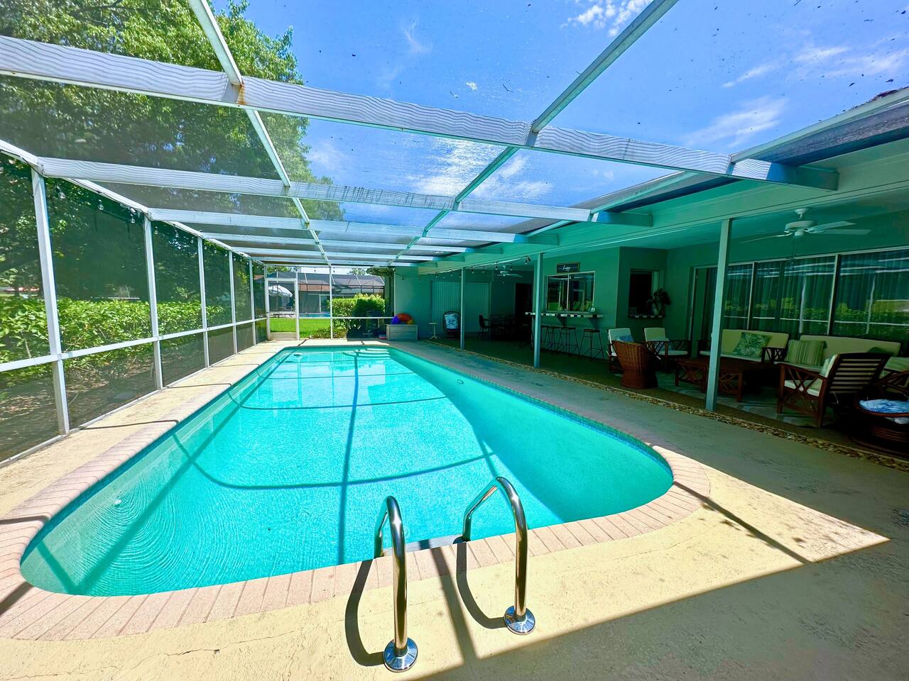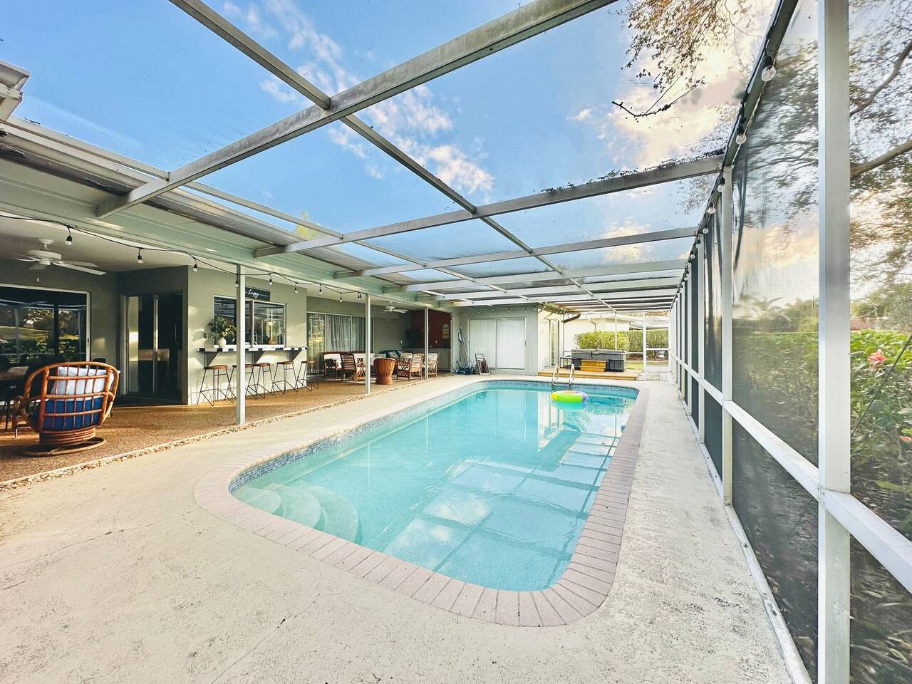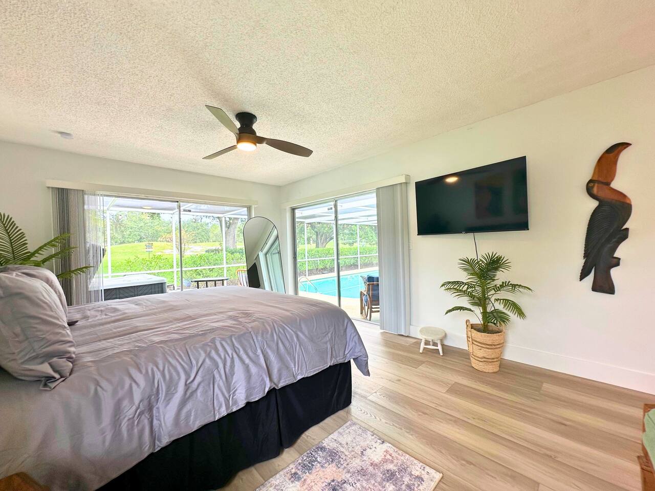 Welcome to our spacious open concept living, kitchen, and dining area. Here, you'll discover everything you need for relaxation and entertainment. Whether you prefer sinking into our plush sofa, gathering around the dining table for a meal, enjoying a lively game of foosball with family and friends, or simply relaxing on the hot tub while enjoying the panoramic view of the pool and golf course, our space is designed to cater to your comfort and enjoyment. Our second living room is a haven of comfort and leisure. It showcases a beautiful grand piano, inviting you to create music and unwind in a serene atmosphere. The room offers a picturesque view of the pool, adding tranquility to your experience. Ample seating options abound with multiple cozy sofas, ensuring everyone can relax and socialize comfortably. Furthermore, the living room offers additional sleeping arrangements: one sofa bed that accommodates 2 guests and another futon that can accommodate 1 guest. Step into our well-appointed kitchen, where cooking becomes a delight! Our space is fully equipped with all the essentials: refrigerator, oven/stove, dishwasher, microwave, blender, coffee maker, toaster, and much more, ensuring you have everything you need for effortless meal preparation. The inviting ambiance is ideal for family gatherings, boasting two dining tables—one indoors accommodating 6 guests and one outdoors accommodating 6 guests —that comfortably seat twelve guests in total. Additionally, we have a breakfast island bar equipped with 6 bar stools, perfect for quick morning meals. Our master bedroom features a luxurious king-size bed with a nightstand, bedside lamp, a TV, and a ceiling fan. A full-length mirror and spacious walk-in closet offer convenience, while a dedicated desk provides a comfortable workspace or simply to enjoy pampering yourself with the natural lighting from Florida's sunshine. The ensuite bathroom provides privacy and luxury. Enjoy direct access to the outdoor hot tub and pool, seamlessly blending indoor comfort with outdoor relaxation. Whether you're resting indoors or enjoying the amenities outside, our master suite is designed for your comfort and enjoyment. Moving to our second bedroom, you'll find a comfortable queen-size bed accompanied by a TV for entertainment, a bedside lamp, nightstand, dresser, shelves, full-length mirror, and a generous closet, ensuring a serene and restful environment. Additionally, this bedroom has a direct access to one of the bathrooms. Bedroom three offers a serene atmosphere with its king-size bed and thoughtful addition of a baby crib, along with a bedside lamp and ample closet space. Bedroom four continues the theme of comfort and convenience with its king-size bed, nightstand with bedside lamp, full-length mirror, closet, providing a peaceful retreat for guests, a rocking chair and a patio door with a direct access to the pool. Each bedroom is equipped with a ceiling fan to ensure comfort and ventilation throughout your stay, completing the welcoming and relaxing atmosphere of our accommodation. Our home features 3 bathrooms designed with your comfort in mind. The Guest Bathroom #1 offers a thoughtfully designed tub-shower combination, a toilet bowl, a hair dryer, and a stylish vanity sinks with two mirrors. Guest Bathroom #2 is equipped with a convenient stand-up shower, a vanity with mirror, a hair dryer, and a toilet bowl and this bathroom has direct access to Bedroom #2. In the Master bathroom, you'll discover vanity sinks with mirrors, a toilet bowl, a bathtub, a hair dryer, and additionally a convenient stand-up shower. We've meticulously designed our Lanai to maximize your outdoor enjoyment. It features a convenient outdoor bar station perfect for mixing drinks and hosting gatherings with ease. Ample seating is provided for lounging and dining al fresco, creating a comfortable and inviting atmosphere. For added luxury, indulge in our pool or hot tub and enjoy the serene golf course landscape beyond or fire up the grill for a barbecue. Our property boasts a washer and dryer conveniently situated in the laundry room by the garage, provided at no extra cost. Moreover, there are two parking spaces available in the driveway. This is a non-smoking property, and this home has Wi-Fi. We provide a starter supply of liquid soap, dish soap, dishwasher soap, paper towel, toilet paper, and garbage bags. About the Area: Located in the heart of Clearwater, our property offers more than just convenient access to Florida's renowned beaches; it provides an ideal retreat for both relaxation and exploration. Just minutes away from our doorstep, Clearwater Beach beckons with its accolade as one of the top beaches in the U.S. The beach's soft, powdery sands and turquoise waters create a picturesque setting perfect for sunbathing, swimming, or enjoying water sports like parasailing and jet skiing. The vibrant beachfront area, including Pier 60, is alive with street performers, artisans, and stunning sunset views, making it a must-visit during your stay. Surrounding our tranquil location are lush green spaces and natural attractions that cater to outdoor enthusiasts. Folly Farms Nature Preserve, a short drive away, invites visitors to explore its pristine woodlands and marshes, offering scenic hiking trails, birdwatching opportunities, and peaceful picnic spots. It's an ideal escape into nature for those seeking tranquility and natural beauty. For those looking to stay active, the nearby Ream Wilson Clearwater Trail offers miles of scenic biking and jogging paths that wind through picturesque landscapes and alongside tranquil waterways. Families will find no shortage of activities to entertain all ages in Clearwater. The Clearwater Marine Aquarium, home to the famous Winter the dolphin from the movie "Dolphin Tale," offers educational exhibits and live animal encounters that inspire and delight visitors. Philippe Park, nestled on the shores of Old Tampa Bay, combines histo