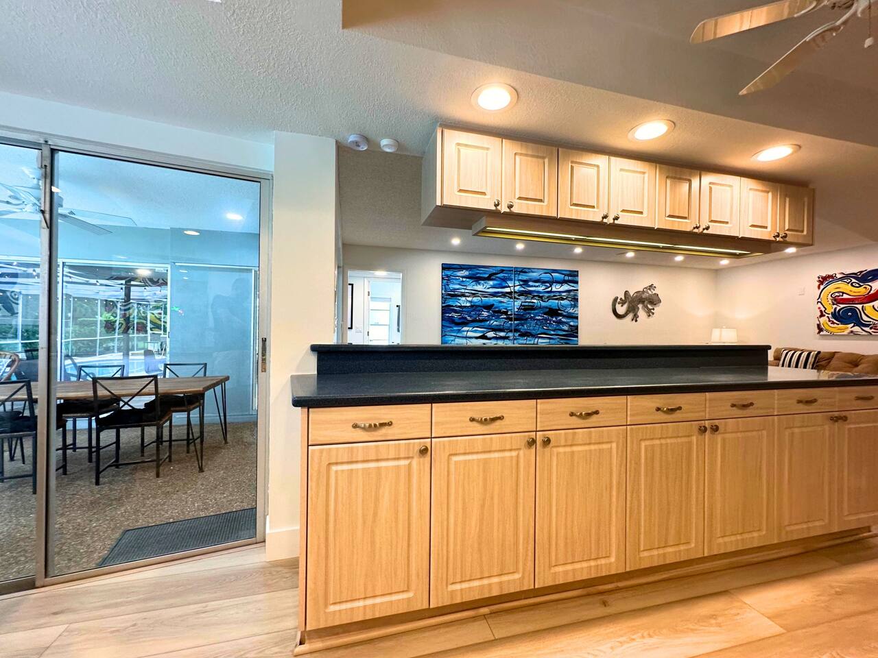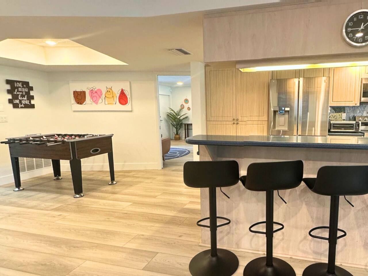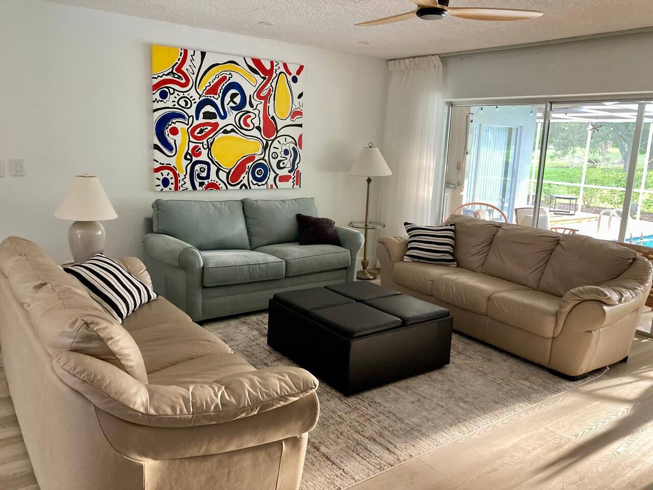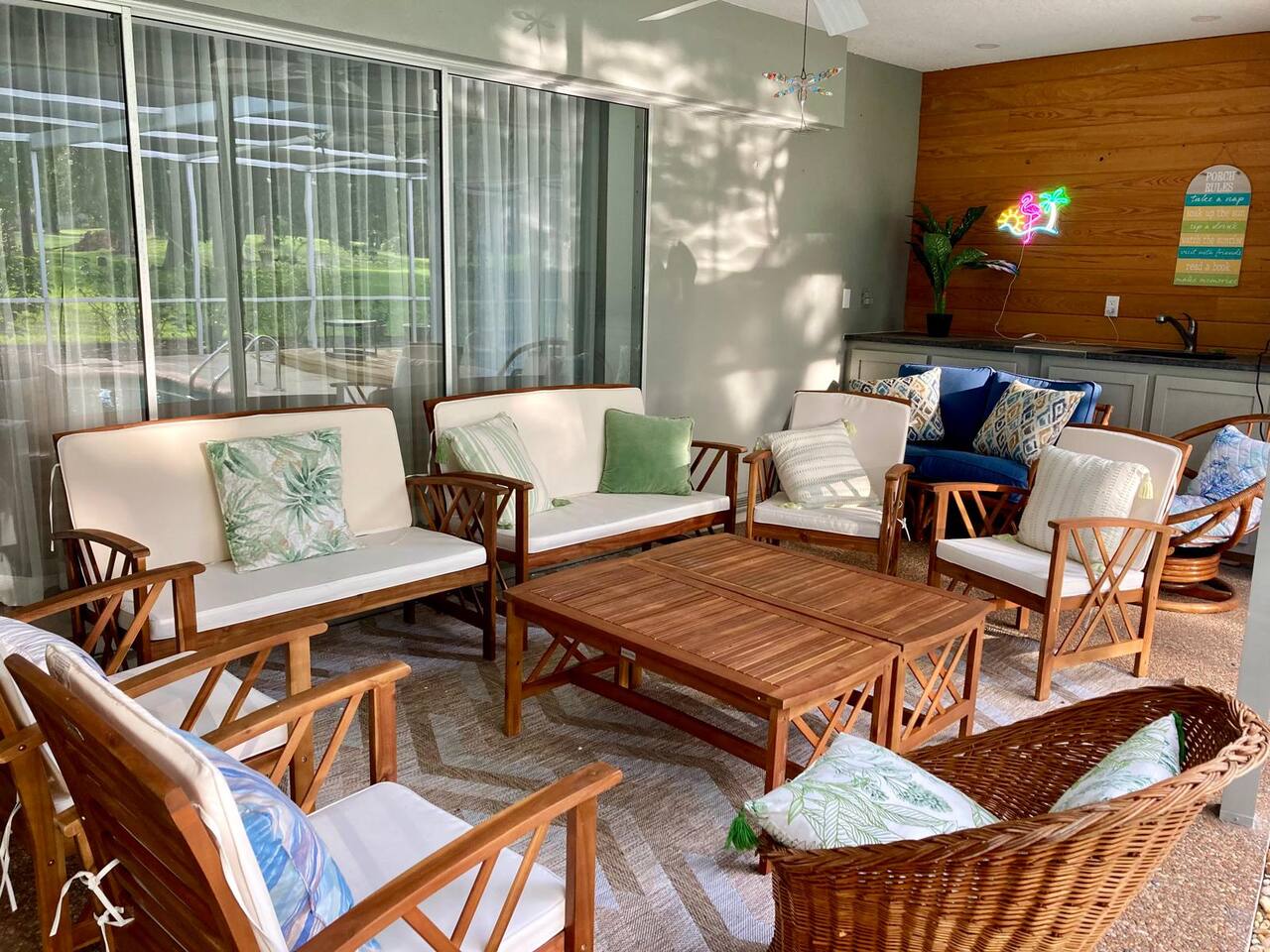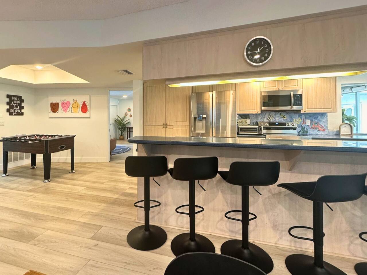 Welcome to our spacious open concept living, kitchen, and dining area. Here, you'll discover everything you need for relaxation and entertainment. Whether you prefer sinking into our plush sofa, gathering around the dining table for a meal, enjoying a lively game of foosball with family and friends, or simply relaxing on the hot tub while enjoying the panoramic view of the pool and golf course, our space is designed to cater to your comfort and enjoyment. Our second living room is a haven of comfort and leisure. It showcases a beautiful grand piano, inviting you to create music and unwind in a serene atmosphere. The room offers a picturesque view of the pool, adding tranquility to your experience. Ample seating options abound with multiple cozy sofas, ensuring everyone can relax and socialize comfortably. Furthermore, the living room offers additional sleeping arrangements: one sofa bed that accommodates 2 guests and another futon that can accommodate 1 guest. Step into our well-appointed kitchen, where cooking becomes a delight! Our space is fully equipped with all the essentials: refrigerator, oven/stove, dishwasher, microwave, blender, coffee maker, toaster, and much more, ensuring you have everything you need for effortless meal preparation. The inviting ambiance is ideal for family gatherings, boasting two dining tables—one indoors accommodating 6 guests and one outdoors accommodating 6 guests —that comfortably seat twelve guests in total. Additionally, we have a breakfast island bar equipped with 6 bar stools, perfect for quick morning meals. Our master bedroom features a luxurious king-size bed with a nightstand, bedside lamp, a TV, and a ceiling fan. A full-length mirror and spacious walk-in closet offer convenience, while a dedicated desk provides a comfortable workspace or simply to enjoy pampering yourself with the natural lighting from Florida's sunshine. The ensuite bathroom provides privacy and luxury. Enjoy direct access to the outdoor hot tub and pool, seamlessly blending indoor comfort with outdoor relaxation. Whether you're resting indoors or enjoying the amenities outside, our master suite is designed for your comfort and enjoyment. Moving to our second bedroom, you'll find a comfortable queen-size bed accompanied by a TV for entertainment, a bedside lamp, nightstand, dresser, shelves, full-length mirror, and a generous closet, ensuring a serene and restful environment. Additionally, this bedroom has a direct access to one of the bathrooms. Bedroom three offers a serene atmosphere with its king-size bed and thoughtful addition of a baby crib, along with a bedside lamp and ample closet space. Bedroom four continues the theme of comfort and convenience with its king-size bed, nightstand with bedside lamp, full-length mirror, closet, providing a peaceful retreat for guests, a rocking chair and a patio door with a direct access to the pool. Each bedroom is equipped with a ceiling fan to ensure comfort and ventilation throughout your stay, completing the welcoming and relaxing atmosphere of our accommodation. Our home features 3 bathrooms designed with your comfort in mind. The Guest Bathroom #1 offers a thoughtfully designed tub-shower combination, a toilet bowl, a hair dryer, and a stylish vanity sinks with two mirrors. Guest Bathroom #2 is equipped with a convenient stand-up shower, a vanity with mirror, a hair dryer, and a toilet bowl and this bathroom has direct access to Bedroom #2. In the Master bathroom, you'll discover vanity sinks with mirrors, a toilet bowl, a bathtub, a hair dryer, and additionally a convenient stand-up shower. We've meticulously designed our Lanai to maximize your outdoor enjoyment. It features a convenient outdoor bar station perfect for mixing drinks and hosting gatherings with ease. Ample seating is provided for lounging and dining al fresco, creating a comfortable and inviting atmosphere. For added luxury, indulge in our pool or hot tub and enjoy the serene golf course landscape beyond or fire up the grill for a barbecue. Our property boasts a washer and dryer conveniently situated in the laundry room by the garage, provided at no extra cost. Moreover, there are two parking spaces available in the driveway. This is a non-smoking property, and this home has Wi-Fi. We provide a starter supply of liquid soap, dish soap, dishwasher soap, paper towel, toilet paper, and garbage bags. About the Area: Located in the heart of Clearwater, our property offers more than just convenient access to Florida's renowned beaches; it provides an ideal retreat for both relaxation and exploration. Just minutes away from our doorstep, Clearwater Beach beckons with its accolade as one of the top beaches in the U.S. The beach's soft, powdery sands and turquoise waters create a picturesque setting perfect for sunbathing, swimming, or enjoying water sports like parasailing and jet skiing. The vibrant beachfront area, including Pier 60, is alive with street performers, artisans, and stunning sunset views, making it a must-visit during your stay. Surrounding our tranquil location are lush green spaces and natural attractions that cater to outdoor enthusiasts. Folly Farms Nature Preserve, a short drive away, invites visitors to explore its pristine woodlands and marshes, offering scenic hiking trails, birdwatching opportunities, and peaceful picnic spots. It's an ideal escape into nature for those seeking tranquility and natural beauty. For those looking to stay active, the nearby Ream Wilson Clearwater Trail offers miles of scenic biking and jogging paths that wind through picturesque landscapes and alongside tranquil waterways. Families will find no shortage of activities to entertain all ages in Clearwater. The Clearwater Marine Aquarium, home to the famous Winter the dolphin from the movie "Dolphin Tale," offers educational exhibits and live animal encounters that inspire and delight visitors. Philippe Park, nestled on the shores of Old Tampa Bay, combines histo