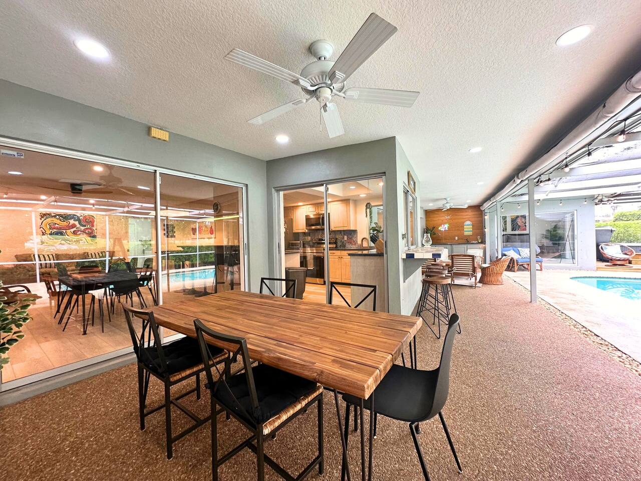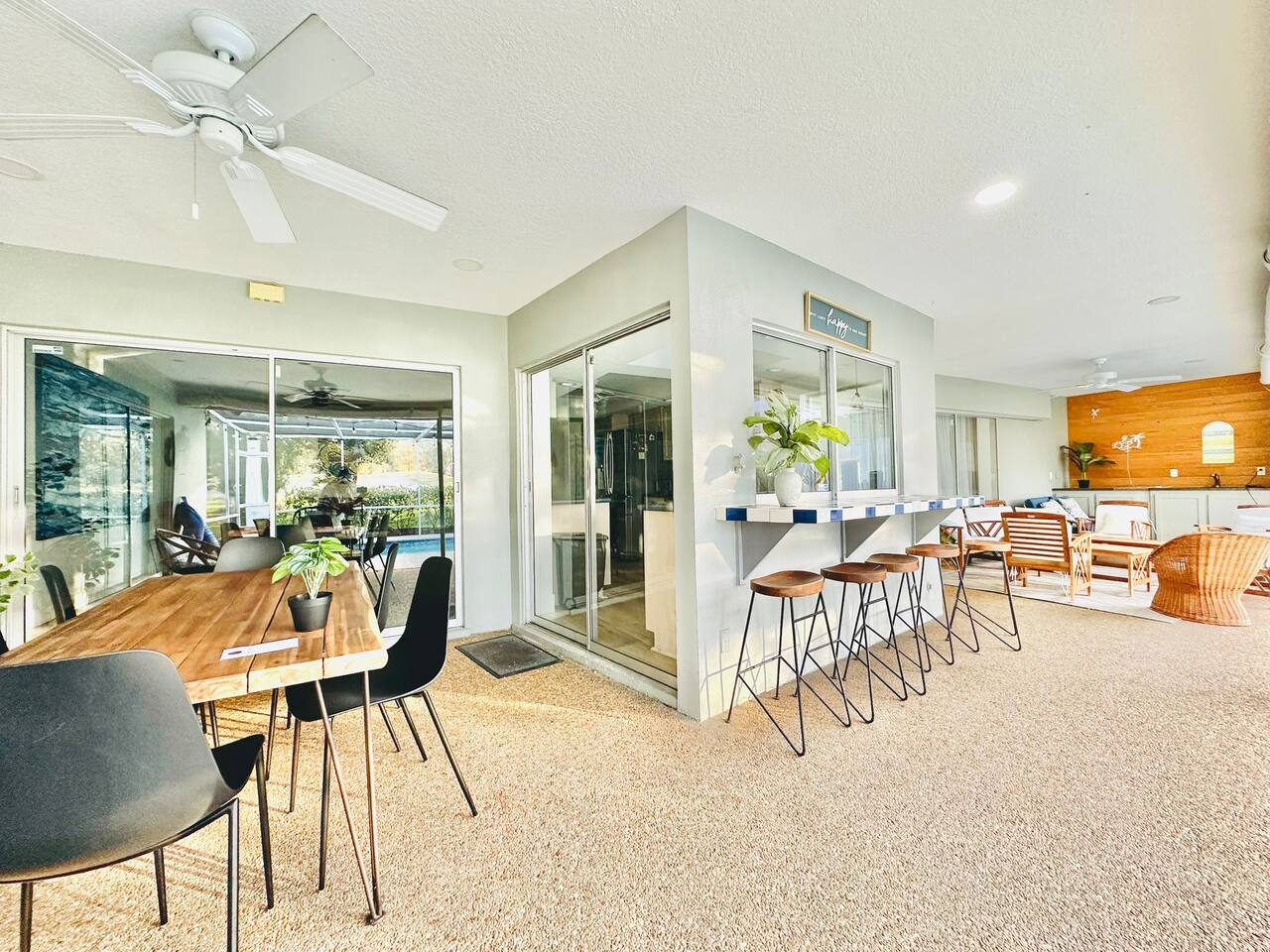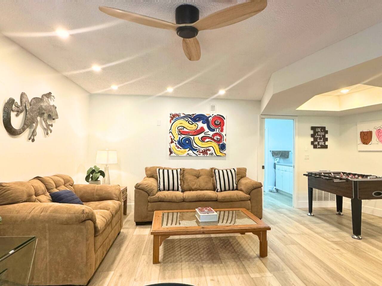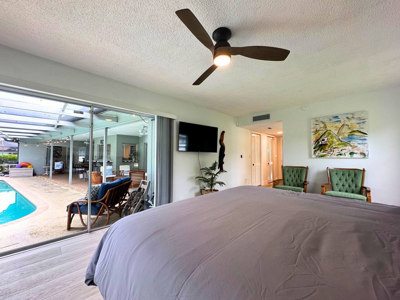 Welcome to our spacious open concept living, kitchen, and dining area. Here, you'll discover everything you need for relaxation and entertainment. Whether you prefer sinking into our plush sofa, gathering around the dining table for a meal, enjoying a lively game of foosball with family and friends, or simply relaxing on the hot tub while enjoying the panoramic view of the pool and golf course, our space is designed to cater to your comfort and enjoyment. Our second living room is a haven of comfort and leisure. It showcases a beautiful grand piano, inviting you to create music and unwind in a serene atmosphere. The room offers a picturesque view of the pool, adding tranquility to your experience. Ample seating options abound with multiple cozy sofas, ensuring everyone can relax and socialize comfortably. Furthermore, the living room offers additional sleeping arrangements: one sofa bed that accommodates 2 guests and another futon that can accommodate 1 guest. Step into our well-appointed kitchen, where cooking becomes a delight! Our space is fully equipped with all the essentials: refrigerator, oven/stove, dishwasher, microwave, blender, coffee maker, toaster, and much more, ensuring you have everything you need for effortless meal preparation. The inviting ambiance is ideal for family gatherings, boasting two dining tables—one indoors accommodating 6 guests and one outdoors accommodating 6 guests —that comfortably seat twelve guests in total. Additionally, we have a breakfast island bar equipped with 6 bar stools, perfect for quick morning meals. Our master bedroom features a luxurious king-size bed with a nightstand, bedside lamp, a TV, and a ceiling fan. A full-length mirror and spacious walk-in closet offer convenience, while a dedicated desk provides a comfortable workspace or simply to enjoy pampering yourself with the natural lighting from Florida's sunshine. The ensuite bathroom provides privacy and luxury. Enjoy direct access to the outdoor hot tub and pool, seamlessly blending indoor comfort with outdoor relaxation. Whether you're resting indoors or enjoying the amenities outside, our master suite is designed for your comfort and enjoyment. Moving to our second bedroom, you'll find a comfortable queen-size bed accompanied by a TV for entertainment, a bedside lamp, nightstand, dresser, shelves, full-length mirror, and a generous closet, ensuring a serene and restful environment. Additionally, this bedroom has a direct access to one of the bathrooms. Bedroom three offers a serene atmosphere with its king-size bed and thoughtful addition of a baby crib, along with a bedside lamp and ample closet space. Bedroom four continues the theme of comfort and convenience with its king-size bed, nightstand with bedside lamp, full-length mirror, closet, providing a peaceful retreat for guests, a rocking chair and a patio door with a direct access to the pool. Each bedroom is equipped with a ceiling fan to ensure comfort and ventilation throughout your stay, completing the welcoming and relaxing atmosphere of our accommodation. Our home features 3 bathrooms designed with your comfort in mind. The Guest Bathroom #1 offers a thoughtfully designed tub-shower combination, a toilet bowl, a hair dryer, and a stylish vanity sinks with two mirrors. Guest Bathroom #2 is equipped with a convenient stand-up shower, a vanity with mirror, a hair dryer, and a toilet bowl and this bathroom has direct access to Bedroom #2. In the Master bathroom, you'll discover vanity sinks with mirrors, a toilet bowl, a bathtub, a hair dryer, and additionally a convenient stand-up shower. We've meticulously designed our Lanai to maximize your outdoor enjoyment. It features a convenient outdoor bar station perfect for mixing drinks and hosting gatherings with ease. Ample seating is provided for lounging and dining al fresco, creating a comfortable and inviting atmosphere. For added luxury, indulge in our pool or hot tub and enjoy the serene golf course landscape beyond or fire up the grill for a barbecue. Our property boasts a washer and dryer conveniently situated in the laundry room by the garage, provided at no extra cost. Moreover, there are two parking spaces available in the driveway. This is a non-smoking property, and this home has Wi-Fi. We provide a starter supply of liquid soap, dish soap, dishwasher soap, paper towel, toilet paper, and garbage bags. About the Area: Located in the heart of Clearwater, our property offers more than just convenient access to Florida's renowned beaches; it provides an ideal retreat for both relaxation and exploration. Just minutes away from our doorstep, Clearwater Beach beckons with its accolade as one of the top beaches in the U.S. The beach's soft, powdery sands and turquoise waters create a picturesque setting perfect for sunbathing, swimming, or enjoying water sports like parasailing and jet skiing. The vibrant beachfront area, including Pier 60, is alive with street performers, artisans, and stunning sunset views, making it a must-visit during your stay. Surrounding our tranquil location are lush green spaces and natural attractions that cater to outdoor enthusiasts. Folly Farms Nature Preserve, a short drive away, invites visitors to explore its pristine woodlands and marshes, offering scenic hiking trails, birdwatching opportunities, and peaceful picnic spots. It's an ideal escape into nature for those seeking tranquility and natural beauty. For those looking to stay active, the nearby Ream Wilson Clearwater Trail offers miles of scenic biking and jogging paths that wind through picturesque landscapes and alongside tranquil waterways. Families will find no shortage of activities to entertain all ages in Clearwater. The Clearwater Marine Aquarium, home to the famous Winter the dolphin from the movie "Dolphin Tale," offers educational exhibits and live animal encounters that inspire and delight visitors. Philippe Park, nestled on the shores of Old Tampa Bay, combines histo