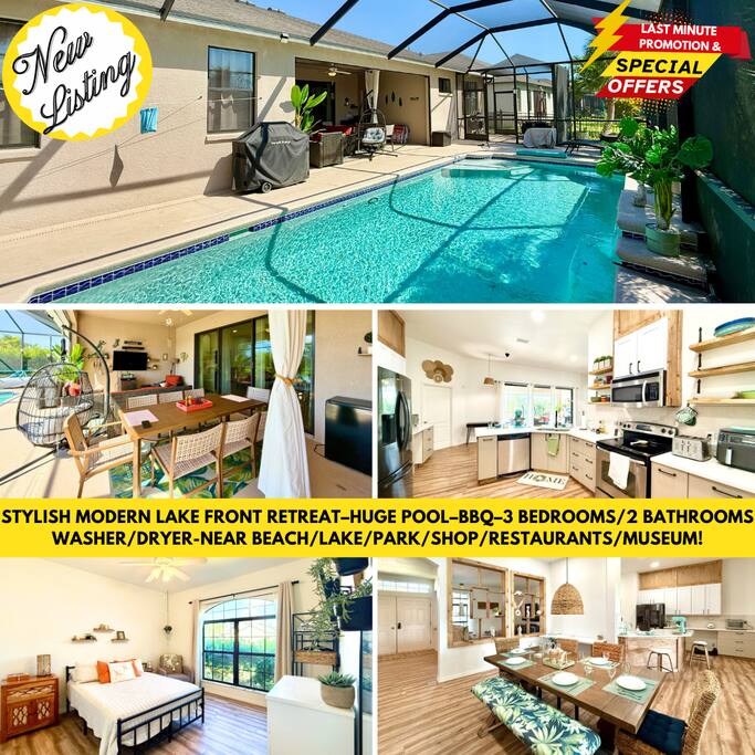 Welcome to your home away from home! Step into style with a warm and inviting entryway that sets the tone for a cozy and elegant stay. This well-lit space features a mirror and a charming wooden storage bench, creating a welcoming first impression. LIVING ROOM Relax in our stylish living room, thoughtfully designed for both comfort and convenience. It features a plush beige sofa, a modern armchair, a sleek partition, a ceiling fan, and a flat-screen TV. Wooden accents and an open layout enhance the serene atmosphere, making it the perfect spot to unwind. OPEN-CONCEPT KITCHEN & DINING The well-appointed kitchen boasts sleek countertops, a breakfast bar, classic cabinetry, and a cozy single sofa. You'll find all essential appliances including a dishwasher, refrigerator, microwave, oven, and stove, plus small appliances like a blender, electric mixer, and toaster. It's fully stocked with cookware for your culinary needs. Adjacent to the kitchen, the dining area features a modern wood and tropical-inspired table that comfortably seats six. A dedicated table and chair also offer a convenient workspace for remote work or study. This area offers direct access to the spacious lanai and screened-in pool. BEDROOMS Master Bedroom is designed with a modern and cozy aesthetic featuring a queen-size bed ,cozy loveseat, ceiling fan, TV, dresser, mirror, ample storage, and large arc-shaped window bringing in natural light. The second bedroom includes a queen-size bed, a closet, drawer, side table, a mirror and a lamp. The third bedroom is designed for restful nights and peaceful mornings, featuring a king-sized bed, a dresser, a closet, a bedside table, and a lamp. BATHROOM The bathroom features a tub-shower combination, a vanity sink with mirror, a toilet and a hairdryer. The second bathroom includes a stand-up shower with a glass partition, a toilet bowl, a vanity sink with a mirror, and a hair dryer. OUTDOOR Unwind in a beautifully designed outdoor patio, complete with cozy wicker seating with cushions, a hanging egg chair, a ceiling fan, a TV, and a spacious wooden dining table with woven chairs comfortably seating up to 8 guests. A BBQ grill adds the perfect touch for outdoor cooking and entertaining. Your view from the patio is a large, screened in sparkling pool, a beautifully lush landscaped backyard and a serene lake—offering the ultimate setting for relaxation and enjoyment. Our property also has a washer and dryer located in the laundry room- free of charge, 2 parking spaces in the driveway. This is a non-smoking property, and this home has Wi-Fi. We provide a starter supply of liquid soap, dish soap, dishwasher soap, paper towel, toilet paper, and garbage bags. ABOUT THE AREA: Apollo Beach is not just about stunning views and outdoor fun—it’s also home to a welcoming, tight-knit community. Locals here are known for their friendly, laid-back vibe, with many residents embracing the coastal lifestyle through boating, fishing, and enjoying the area’s natural beauty. Attractions like E.G. Simmons Park offer peaceful escapes, perfect for a day out with friends and family. The area also boasts fantastic boating, fishing, and water sports, with the local marinas and boat ramps staying active year-round. Apollo Beach might be small, but it’s full of heart, with locals always ready to share their love for the outdoors and the laid-back lifestyle they cherish.